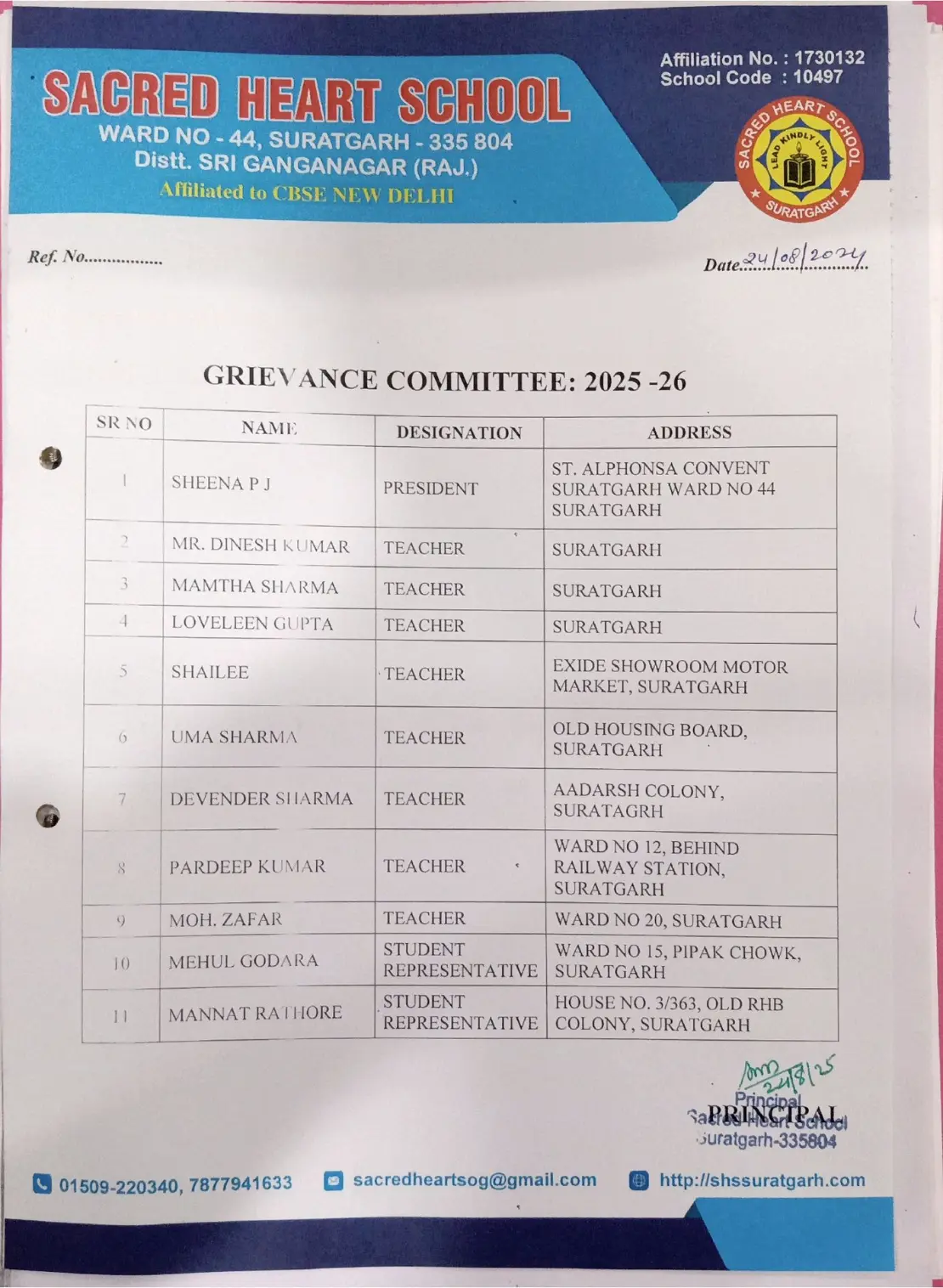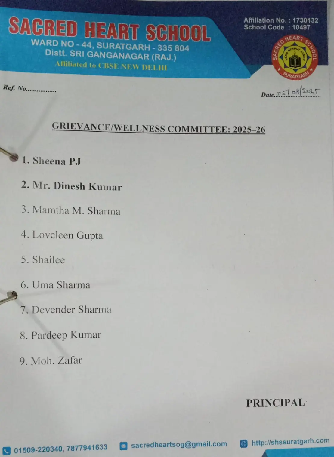 The Grievance Committee is constituted to address and resolve the concerns and complaints of students, parents, and staff in a fair and transparent manner. The committee ensures that grievances are handled promptly, confidentially, and impartially, fostering a safe, respectful, and supportive environment within the institution.
